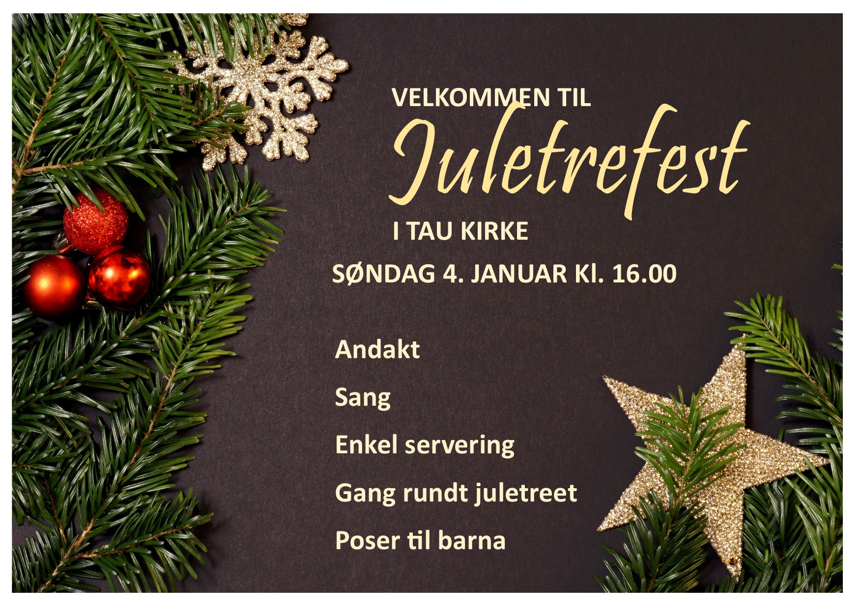Juletrefest for alle generasjoner. Sang og musikk, andakt, gang rundt juletreet, pose til barna, enkel bevertning. Velkommen!